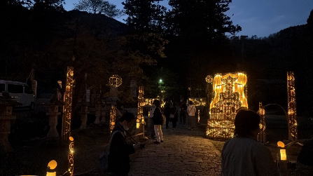 ![]() 岐阜県揖斐郡揖斐川町、谷汲山華厳寺の山門にて、 「竹のぬくもりイルミネーション2026」が開催されています。 間伐材として廃棄される竹を材料にして、 丸い穴をあけて中に灯りをともします。 私が勤務している西濃学園中学校と谷汲中学校の生徒たちも 自作の灯籠で参加しました。 谷汲中学校は、今年で4回目の参加とあって、 灯籠つくりもすっかり慣れっこです。 西濃学園は初めての参加なので、 美術の授業の課題として、灯籠作りをしました。 初めて使う大きなドリルは、 少しこわかったことと思いますが、全員が美しい灯籠を 完成させることができました。 材料、道具、すべてご用意くださり、 指導にきてくださった川渕皓平さんには、 心より感謝申し上げます。 黄昏から宵へと移り変わる闇の色に、 竹のあかりのぬくもりが、溶けるようになじんでいき、 時が止まったような空間をつくりだしていました。 4月12日(日)夜20:00まで開催しています。 (点灯時間は、18:00~20:00) ![]() ![]() ![]() |