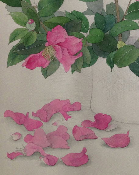 山茶花(さざんか)写生 透明水彩、色鉛筆