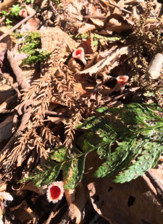 小さな栗のイガ、サザンカの花びら、ヨモギの葉、