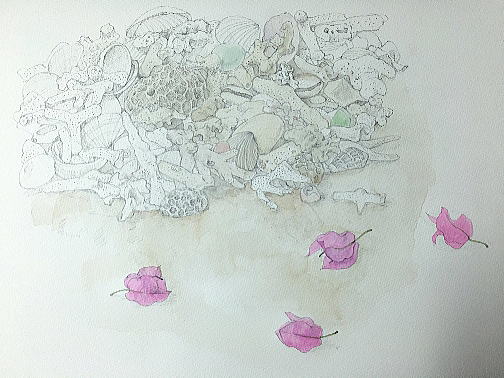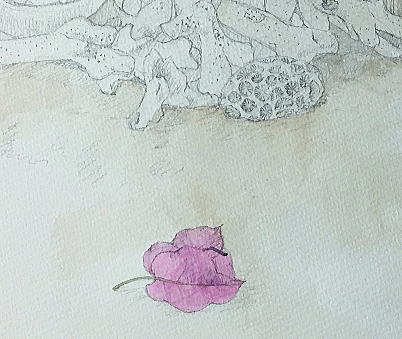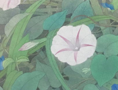 花以外の部分を、墨と水干絵の具でやや濃いめに彩色した上に、